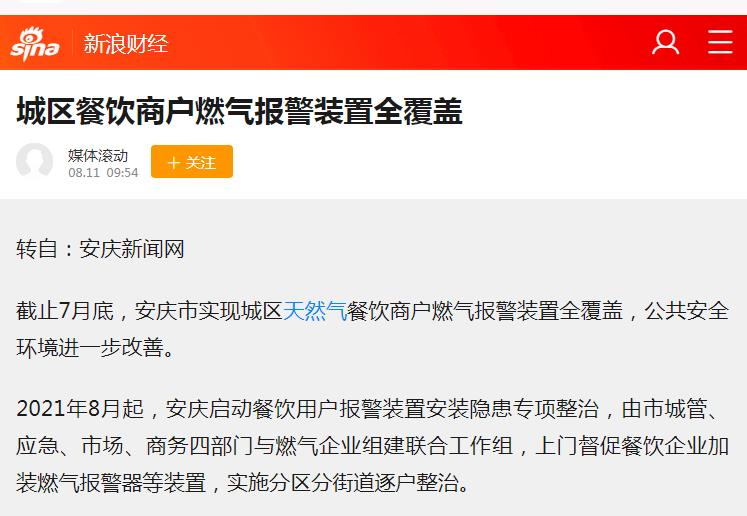 城區(qū)餐飲商戶燃?xì)鈭?bào)警裝置全覆蓋(轉(zhuǎn)載于新浪財(cái)經(jīng))