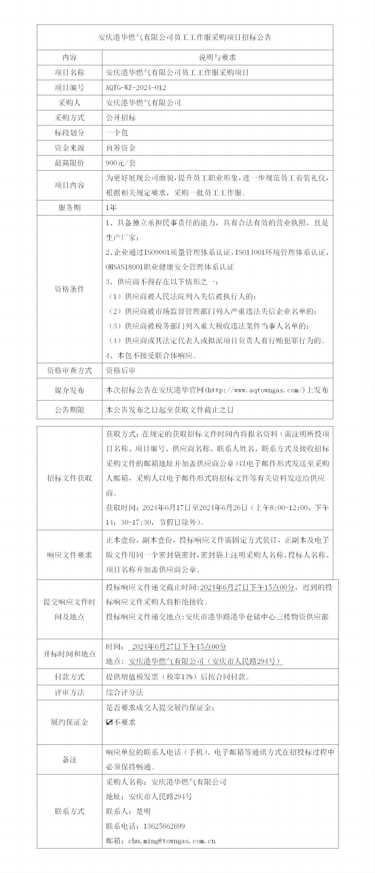 安慶港華燃氣有限公司員工工作服采購項目招標公告