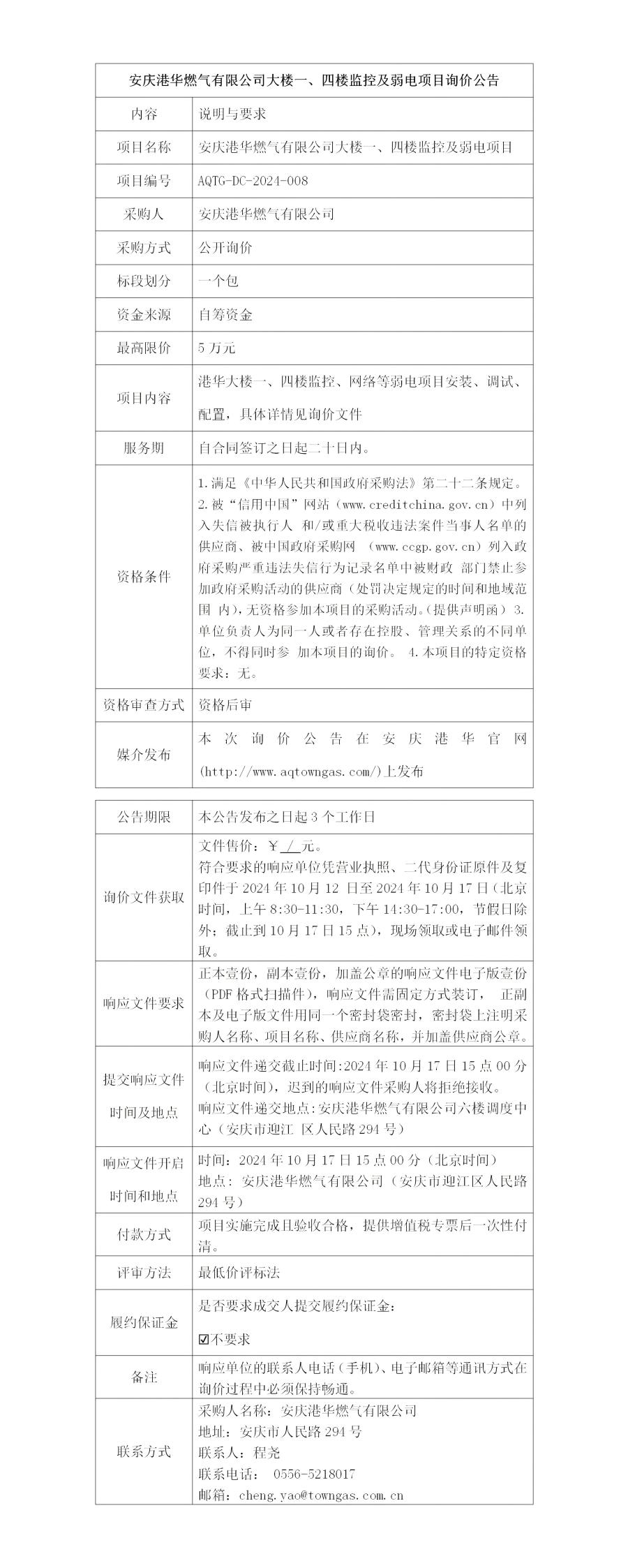 安慶港華燃?xì)庥邢薰敬髽且弧⑺臉潜O(jiān)控及弱電項(xiàng)目詢價(jià)公告