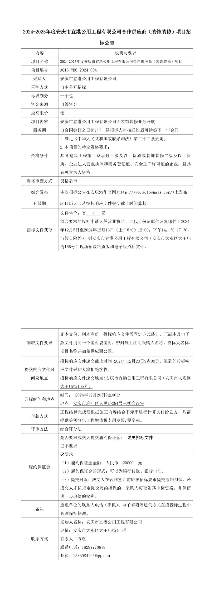 2024-2025年度安慶市宜港公用工程有限公司合作供應(yīng)商(裝飾裝修)項目招標公告