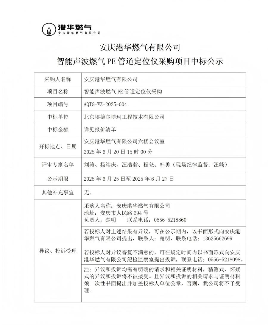安慶港華燃?xì)庥邢薰局悄苈暡ㄈ細(xì)釶E管道定位儀采購(gòu)項(xiàng)目中標(biāo)公示