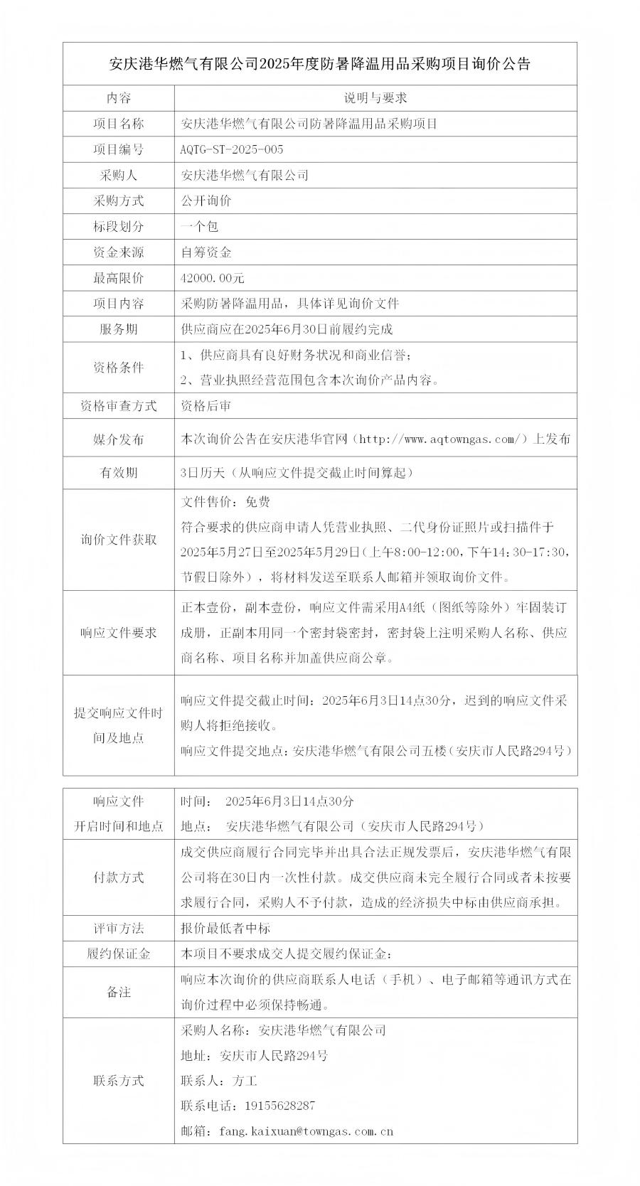 安慶港華燃?xì)庥邢薰?025年度防暑降溫用品采購項目詢價公告